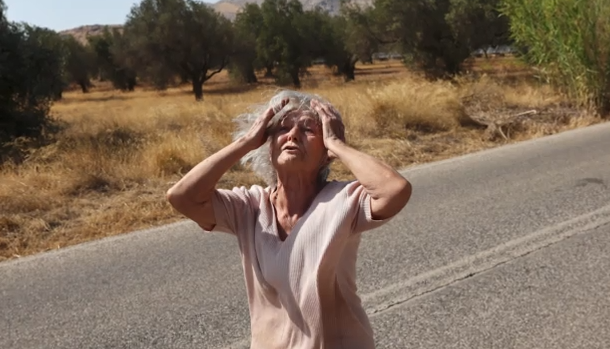 Σηκώνει τα χέρια προς τον ουρανό και ζητάει βοήθεια από τον Θεό. Απόγνωση. Πιάνει το κεφάλι της μη μπορώντας να πιστέψει το εφιαλτικό σκηνικό που ξετυλίγεται μπροστά της.