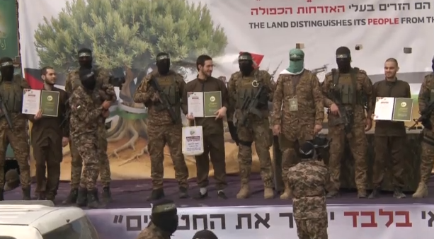 Πάνοπλοι μασκοφόροι της Χαμάς παραδίδουν τον 40χρονο Ταλ Σοχάμ και τον 39χρονο Αβέρα Μενγκίστου στον Διεθνή Ερυθρό Σταυρό.