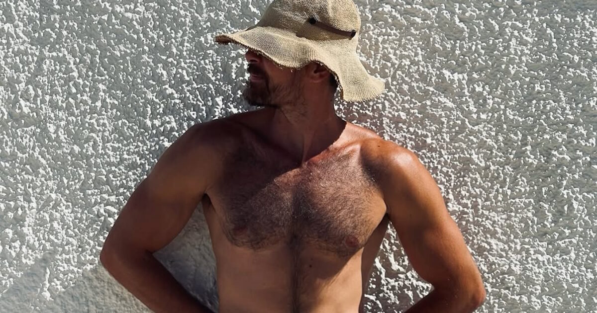 Ο γοητευτικός καλλιτέχνης πόζαρε φορώντας μόνο το μαγιό του και ένα ψάθινο καπέλο και έδειχνε χαλαρός και ευδιάθετος.