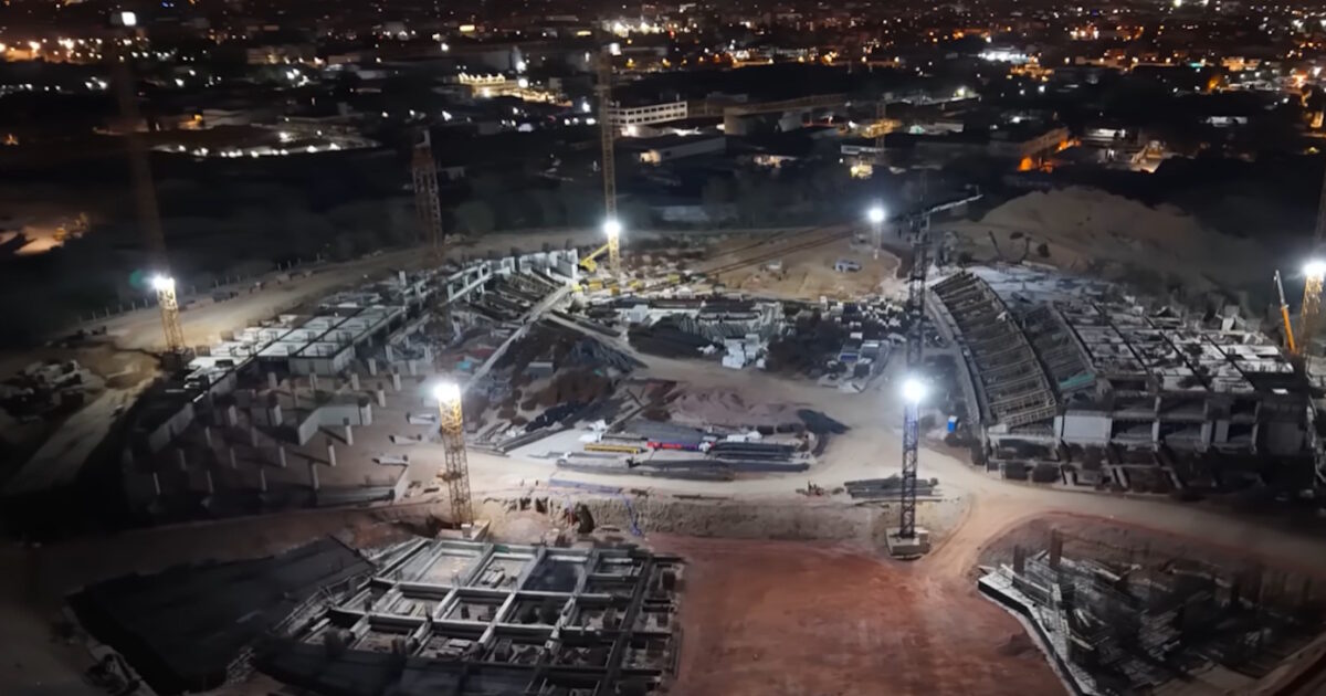 Στα πλάνα διακρίνονται διαμορφωμένοι χώροι των κερκίδων, οι βάσεις για τις εξέδρες και τα πρώτα σημεία που θα τοποθετηθούν στα σκέπαστρα. Ο φωτισμός μέσα στη νύχτα, κάνει άκρως εντυπωσιακά τα συγκεκριμένα πλάνα.