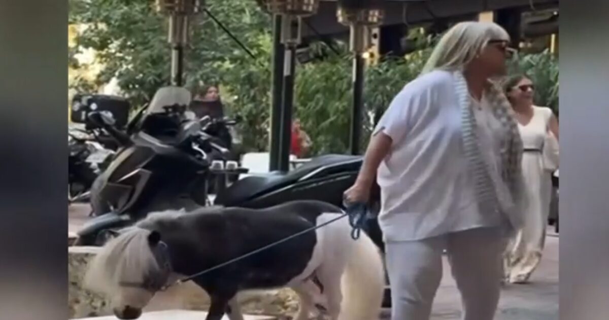 Το φοβερό στιγμιότυπο κατέγραψε περαστικός. Στα πλάνα φαίνεται μία γυναίκα να κρατά με λουρί το πόνυ της και να περπατούν μαζί σε πεζοδρόμιο, στο κέντρο της Αθήνας.