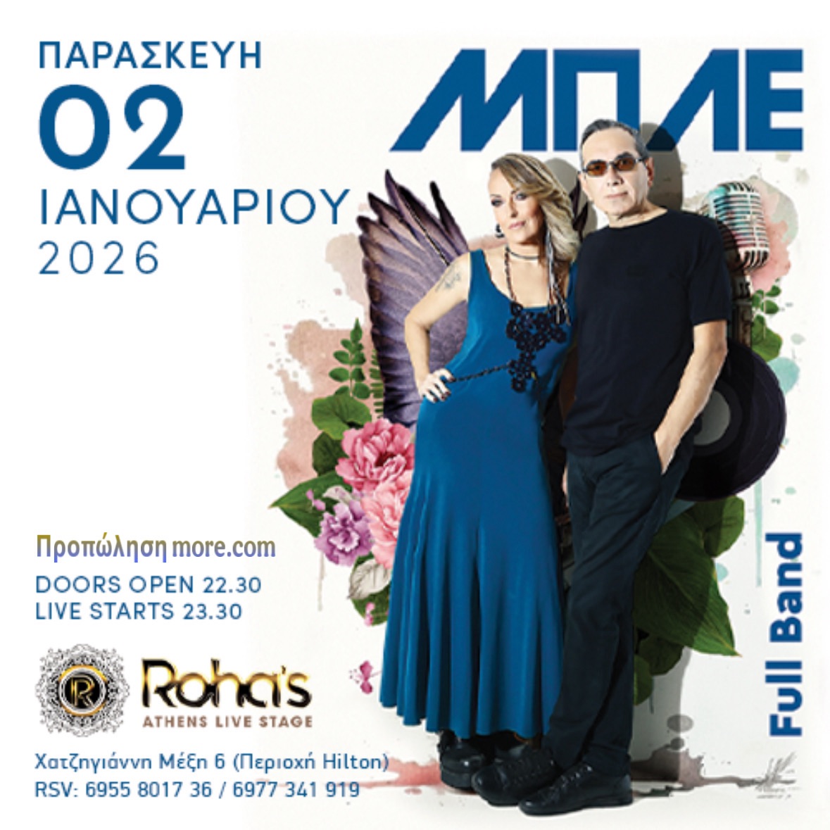 Με την πρώτη ανάσα του νέου χρόνου, οι Μπλε έρχονται για ένα μοναδικό Live στη σκηνή του Rohas Live Stage για μία εμφάνιση που αναμένεται να ξεχωρίσει. Με διαχρονικά τραγούδια, χαρακτηριστικό ήχο και την εκρηκτική Τζώρτζια Κεφαλά στο μικρόφωνο, κάθε εμφάνισή τους μετατρέπεται σε μια καθηλωτική εμπειρία που συναρπάζει το κοινό.