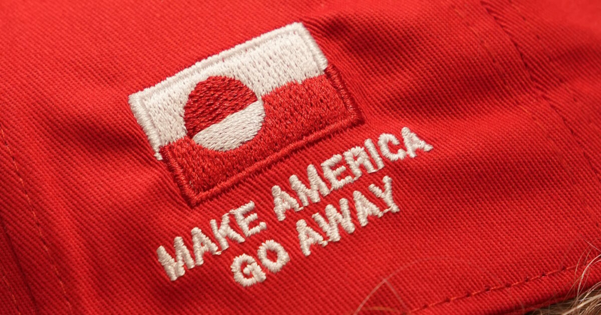 Τα κόκκινα καπελάκια μοιάζουν με εκείνα που φορούν οι υποστηρικτές του Τραμπ αλλά το σλόγκαν τους διαφέρει σημαντικά: αν και σχηματίζει το αρκτικόλεξο MAGA του Ρεπουμπλικάνου, μεταφράζετε «Κάντε την Αμερική να φύγει από εδώ» (Make America Go Away). Ένα δεύτερο σύνθημα δηλώνει ότι η Αμερική είναι «Ήδη Μεγάλη».
