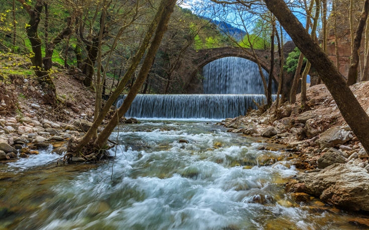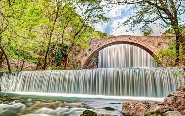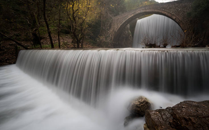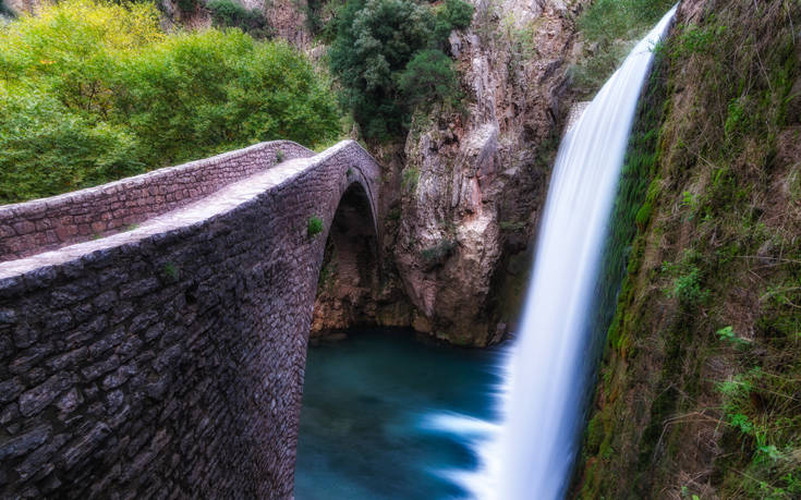 Το επιβλητικό μονότοξο γεφύρι δεσπόζει σε ένα στένωμα, περίπου μισό χιλιόμετρο από την Κάτω Παλαιοκαρυά. Δύο φράγματα του 1970 σχηματίζουν δύο τεχνητούς καταρράκτες, που δίνουν μια ξεχωριστή πινελιά στην μαγευτική εικόνα. Η κατασκευή του τοποθετείται γύρω στα 1500 και έχει μήκος 26 μέτρα, ενώ οι εντυπωσιακοί καταρράκτες φτάνουν τα 12 και τα 2 μέτρα αντίστοιχα.