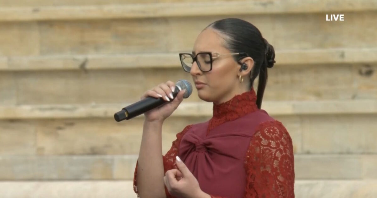 Η Klavdia εμφανίστηκε στο κέντρο του Παναθηναϊκού Σταδίου, φορώντας ένα λιτό κόκκινο φόρεμα και τραγούδησε την “Αστερομάτα”.
