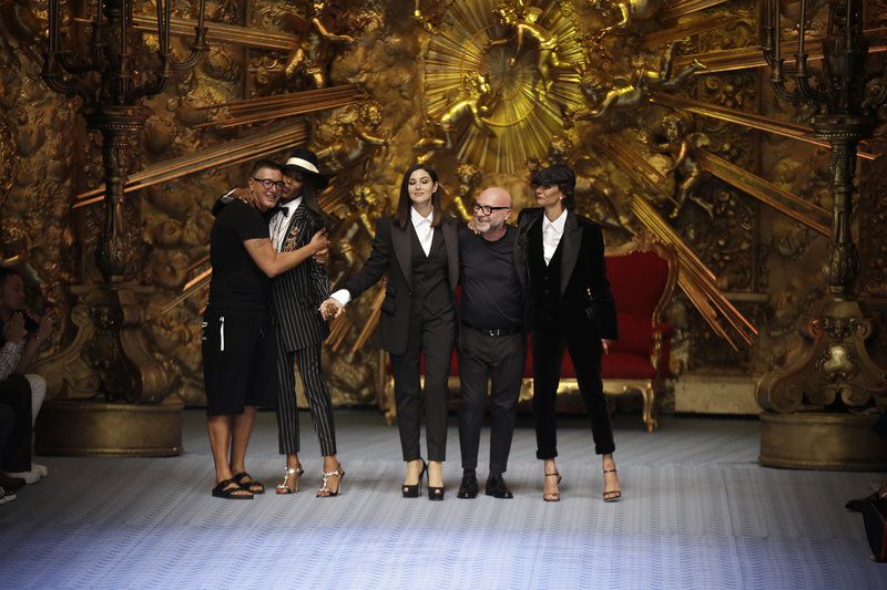 Όμως, η πρώτη έκπληξη που επιφύλαξαν οι οργανωτές ήταν η εμφάνιση, στην έναρξη του σόου, της Μόνικας Μπελούτσι, που ανέβηκε για τελευταία φορά στην πασαρέλα το 1992, επίσης για τους Dolce&Gabbana. Η πανέμορφη ηθοποιός φόρεσε μαύρο κοστούμι.