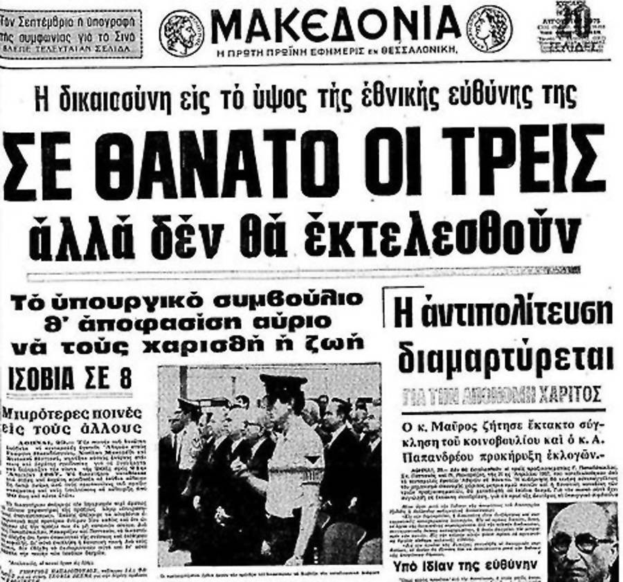 Την ίδια μέρα από κυβερνητική ανακοίνωση διαφαίνεται ότι οι επιβληθείσες θανατικές καταδίκες θα μετατραπούν σε ισόβια. Ξεσπά θύελλα αντιδράσεων από την αντιπολίτευση. Στις 25 Αυγούστου ο Κ. Καραμανλής συγκαλεί εκτάκτως το Υπουργικό Συμβούλιο, το οποίο αποφασίζει ομόφωνα να κινηθεί η διαδικασία για τη μετατροπή της θανατικής καταδίκης των τριών σε ισόβια δεσμά.