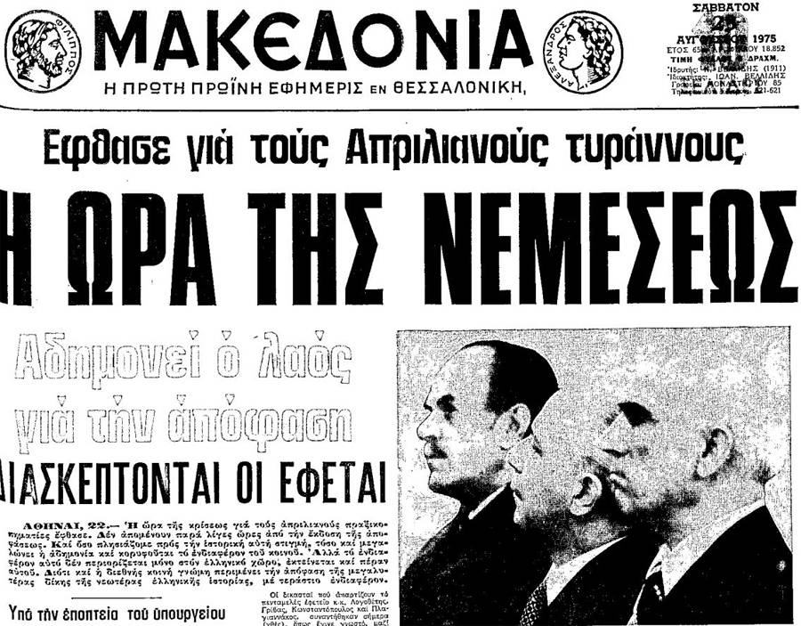 Περίπου ένα χρόνο αργότερα, το πρωινό της Δευτέρας 28 Ιουλίου 1975 είχε έρθει η ώρα της Δικαιοσύνης. Συνολικά 20 πρωτεργάτες της χούντας κάθισαν στο εδώλιο του κατηγορουμένου για το πραξικόπημα.