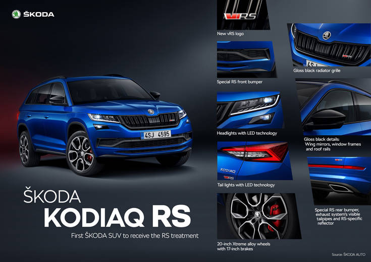 Το Kodiaq RS διαθέτει συγκεκριμένα RS χαρακτηριστικά, συμπεριλαμβανομένων των νέων προφυλακτήρων και των μαύρων στιλπνών στοιχείων όπως η γρίλια της μάσκας, τα περιγράμματα στα παράθυρα και τα καλύμματα των εξωτερικών καθρεπτών, καθώς και στους full LED προβολείς. Ο βασικός εξοπλισμός περιλαμβάνει το σύστημα τετρακίνησης, την ενεργητική προσαρμοζόμενη ανάρτηση Dynamic Chassis Control (DCC) και το προοδευτικό σύστημα διεύθυνσης.