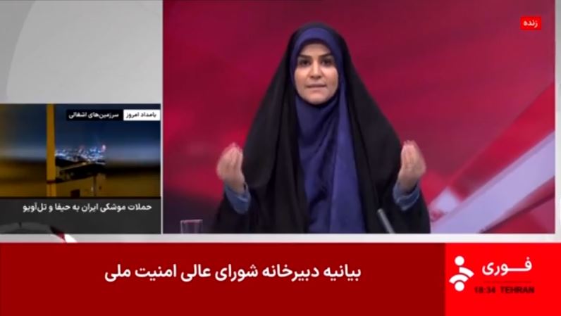 «Aν παρέχονται οχήματα… και άλλα θέματα. Σας ευχαριστούμε που είστε μαζί μας. Αυτό που παρατηρείτε είναι η επιθετικότητα του Σιωνιστικού καθεστώτος εναντίον της γης της Ισλαμικής Δημοκρατίας και των κρατικών ΜΜΕ. Αυτό που παρατηρήσατε, αυτό που ακούσατε, αυτή η σκόνη στον αέρα. Ο Θεός είναι μεγάλος», ανέφερε παρουσιάστριας της ιρανικής τηλεόρασης.