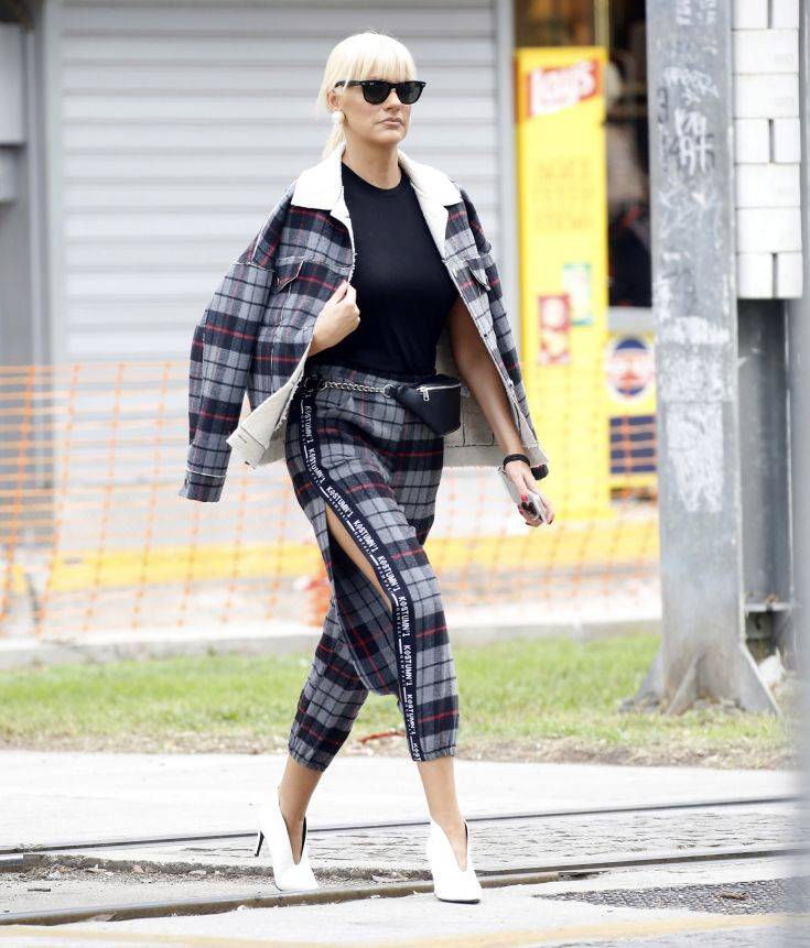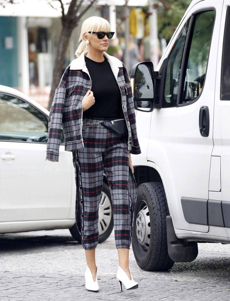 Η Σάσα Σταμάτη τράβηξε τα βλέμματα με το στιλ της, φορώντας ένα καρό κοστούμι, με άνοιγμα στο πλάι, λευκά παπούτσια και τσαντάκι μέσης.
