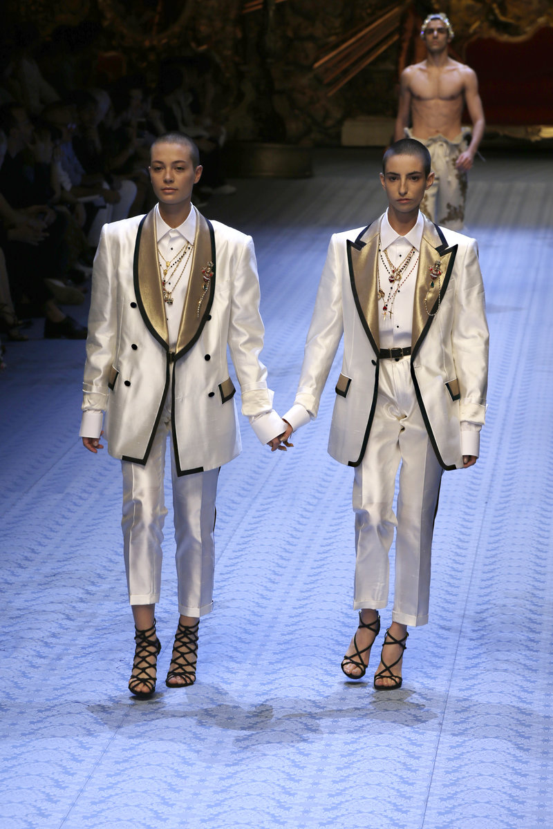 Στην πασαρέλα περπάτησαν ζευγάρια ετεροφυλόφιλων, άνδρες και γυναίκες, αλλά και πιο ηλικιωμένες γυναίκες μαζί με νεαρούς συντρόφους ή πενηντάρηδες με μικρότερης ηλικίας γυναίκες στο πλευρό τους.