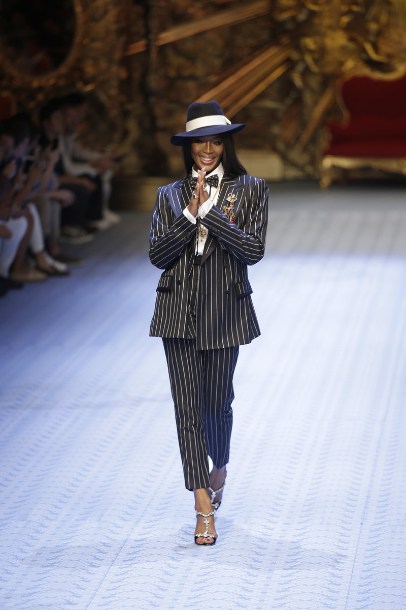 Επόμενη έκπληξη, η εμφάνιση της Ναόμι Κάμπελ με ανδρόγυνο κοστούμι, και αυτή, και καπέλο στα μαλλιά, θυμίζοντας αρχιμαφιόζο.