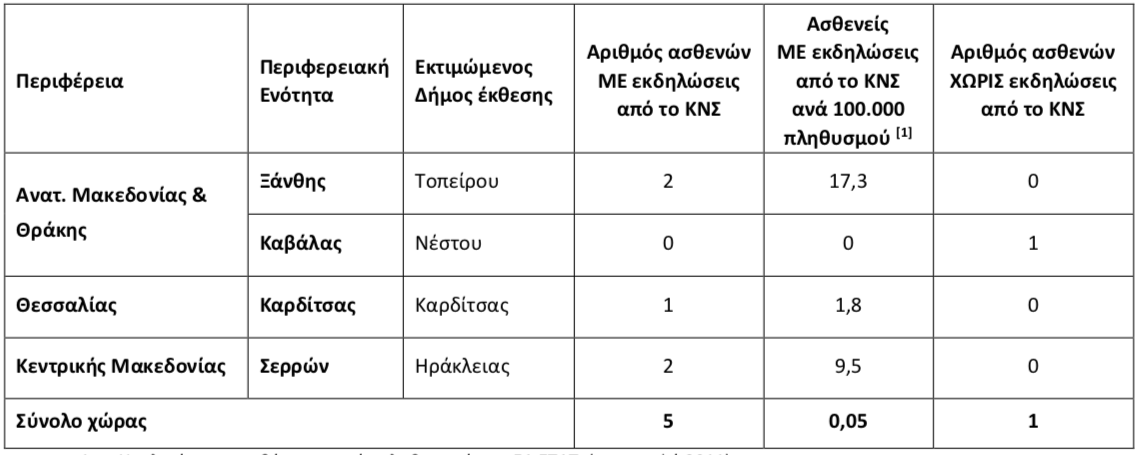 Η εβδομαδιαία αυτή αναφορά του ΕΟΔΥ για τη λοίμωξη από τον ιό του Δυτικού Νείλου (ΔΝ) αναφέρει έξι (6) κρούσματα λοίμωξης από τον ιό του Δυτικού Νείλου στην Ελλάδα, εκ των οποίων τα πέντε (5) παρουσίασαν εκδηλώσεις από το Κεντρικό Νευρικό Σύστημα (ΚΝΣ, εγκεφαλίτιδα ή/και μηνιγγίτιδα ή/και οξεία χαλαρή παράλυση) και ένα (1) είχε ήπιες εκδηλώσεις (εμπύρετο νόσημα)/ δεν είχε εκδηλώσεις από το ΚΝΣ