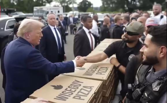 Με ένα αστείο για τον προκάτοχο του, Τζο Μπάιντεν, ο Τραμπ ξεκίνησε την επίσκεψή του στους αστυνομικούς και τους εθνοφρουρούς που περιπολούν τους δρόμους της Ουάσιγκτον. Στη συνέχεια τους προσέφερε πίτσες και μπέργκερ, φτιαγμένα, όπως είπε, στον Λευκό Οίκο.