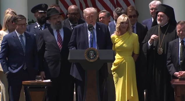 Ο Ντόναλντ Τραμπ προσεύχεται στους κήπους του Λευκού Οίκου, παρουσία και του Αρχιεπισκόπου Αμερικής Ελπιδοφόρου.