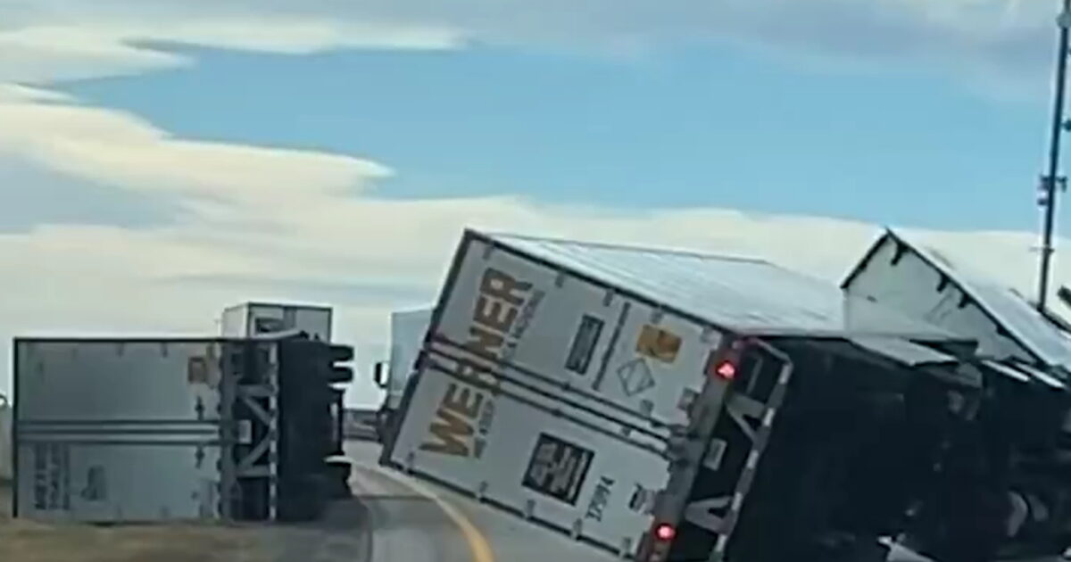 Caught on camera: Watch as a semi flips over from strong winds along I-25 in Wyoming. pic.twitter.com/J6LpeKeda5