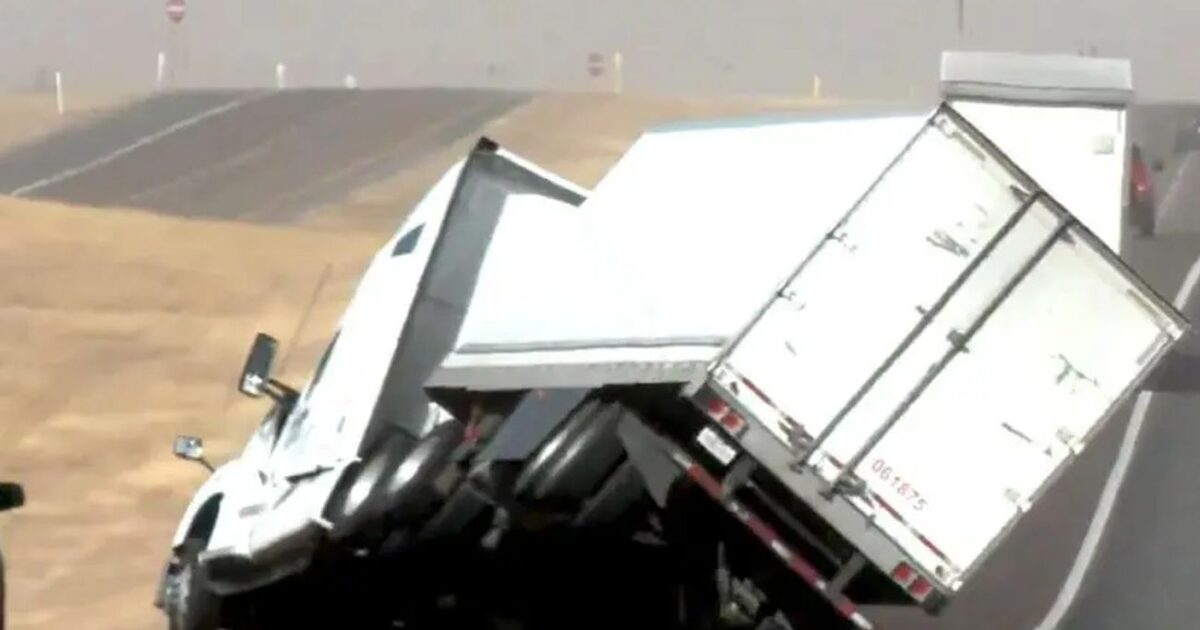 Βίντεο καταγράφει τη στιγμή που ισχυροί άνεμοι ανατρέπουν νταλίκα εν κινήσει σε αυτοκινητόδρομο κοντά στο Ντούμας, στην πολιτεία του Τέξας, στις ΗΠΑ. Το περιστατικό σημειώθηκε στην περιοχή Πανχάντλ και είχε ως αποτέλεσμα να διακοπεί η κυκλοφορία για αρκετές ώρες.