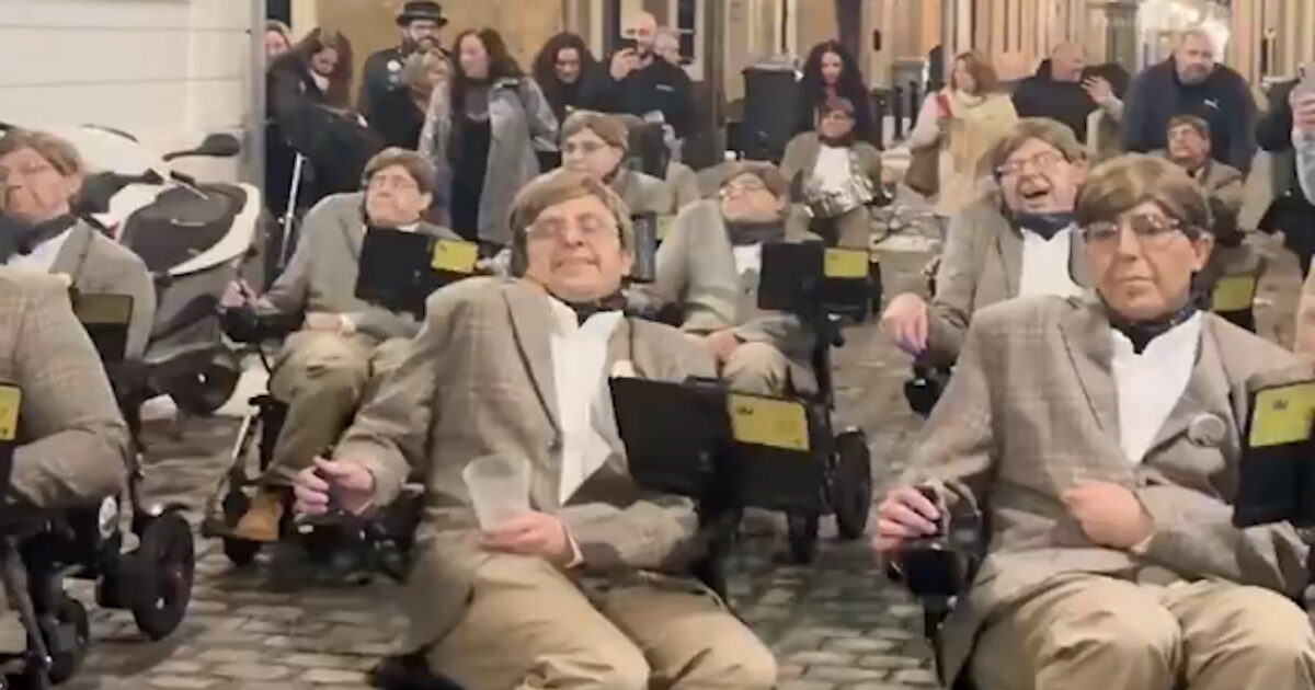 Μια ομάδα 12 ανδρών σε αναπηρικά αμαξίδια εθεάθη να διασχίζει τα πλακόστρωτα δρομάκια της πόλης, τραγουδώντας «Πόσο όμορφο, πόσο όμορφο είναι το Κάντιθ».