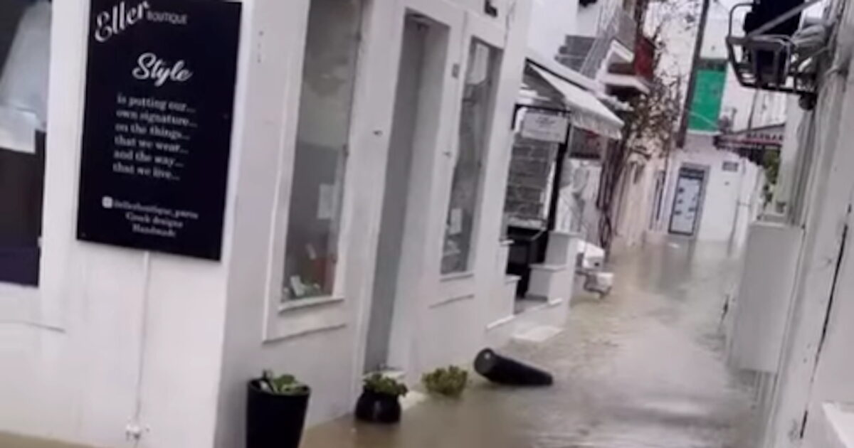 Μεγάλα προβλήματα σημειώθηκαν και στη Πάρο με τα ιστορικά σοκάκια να έχουν μετατραπεί σε λίμνες.