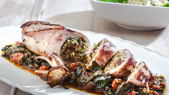 περίπου 1,3 κιλά μέτρια καλαμάρια (περίπου 150 γρ. το καθένα – όσο γίνεται ίδιου μεγέθους), φρέσκα ή κατεψυγμένα, καθαρισμένα, ολόκληρα (κρατάμε χώρια τα πλοκάμια άκοπα)