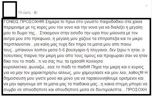Συγκεκριμένα όπως καταγγέλλει η ίδια, χθες την ώρα που βρισκόταν σε γνωστό πολυκατάστημα των Χανίων μαζί με τα δυο της παιδιά και με οικεία πρόσωπα, είδε μπροστά στα μάτια της την απόπειρα απαγωγής του παιδιού της.