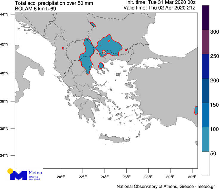 Τα ύψη βροχής θα είναι σημαντικά στη Μακεδονία και θα ξεπεράσουν τα 50 mm κατά τη διάρκεια της κακοκαιρίας, όπως υπολογίζεται από το αριθμητικό μοντέλο πρόγνωσης καιρού του Εθνικού Αστεροσκοπείου Αθηνών / meteo.gr και παρουσιάζεται στο Χάρτη 1 (Υπενθυμίζεται ότι 1 mm βροχής αντιστοιχεί σε ποσότητα ενός λίτρου νερού, σε μια επιφάνεια 1 τετραγωνικού μέτρου).