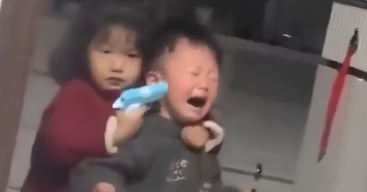 Όπως φαίνεται στα πλάνα, ο μικρός από την Κίνα δεν δείχνει να συμμερίζεται καθόλου το παιχνίδι και ξεσπά σε λυγμούς, ενώ το περιστατικό καταγράφεται από μέλος της οικογένειας που παρακολουθεί τη σκηνή. Το κοριτσάκι, από την άλλη, φαίνεται αποφασισμένο να εκβιάσει με αυτόν τον τρόπο την μητέρα του για να της δώσει καραμέλες.