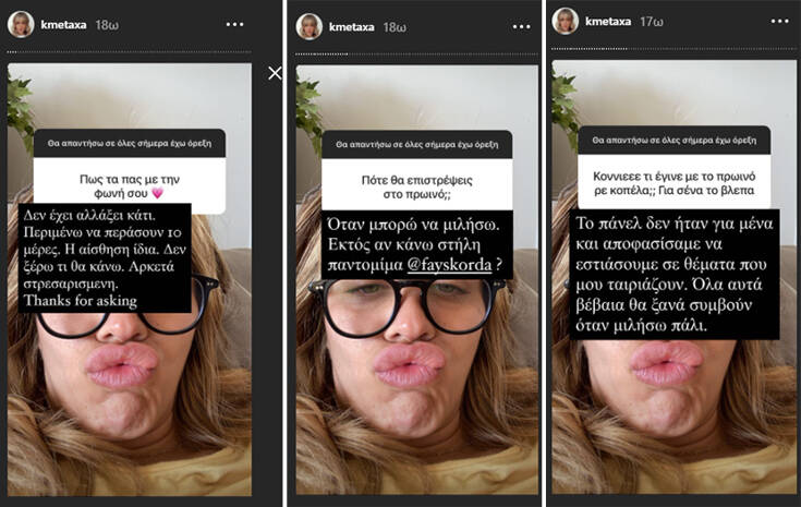 «Το πάνελ δεν ήταν για εμένα και αποφασίσαμε να εστιάσουμε σε θέματα που μου ταιριάζουν. Όλα αυτά βέβαια θα ξανασυμβούν όταν μιλήσω πάλι» απάντησε χαρακτηριστικά η Κόνι Μεταξά.