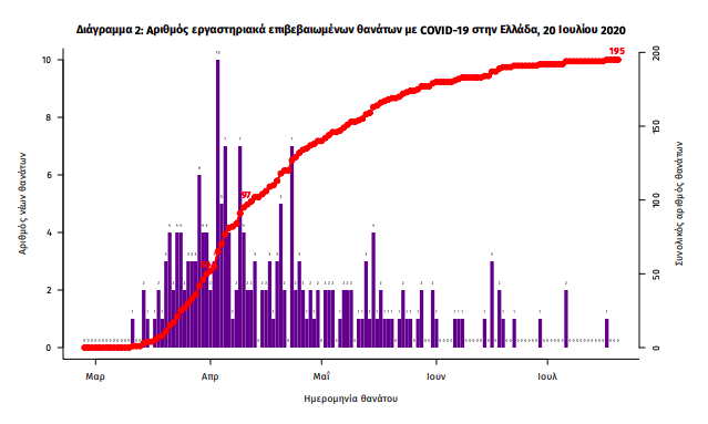 Οι νέοι θάνατοι ασθενών με COVID-19 είναι 2, ενώ από την έναρξη της επιδημίας έχουν καταγραφεί συνολικά 197 θάνατοι. Η μέση ηλικία των ασθενών που απεβίωσαν είναι 76 έτη.