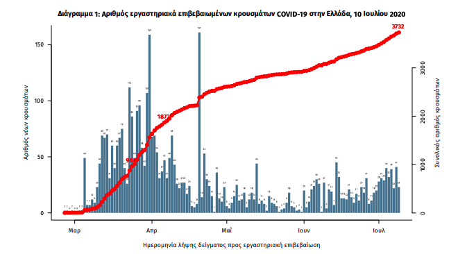 Σύμφωνα με τα στοιχεία που παρουσιάζονται και αφορούν περιστατικά από την επιδημιολογική επιτήρηση της νόσου από το νέο κορωνοϊό (COVID19), με βάση τα δεδομένα που έχουν δηλωθεί στον ΕΟΔΥ και καταγραφεί μέχρι τις 10 Ιουλίου 2020 (ώρα 15:00), τα νέα εργαστηριακά επιβεβαιωμένα κρούσματα της νόσου είναι 60, εκ των οποίων τα 40 εντοπίστηκαν κατόπιν ελέγχων στις πύλες εισόδου της χώρας.