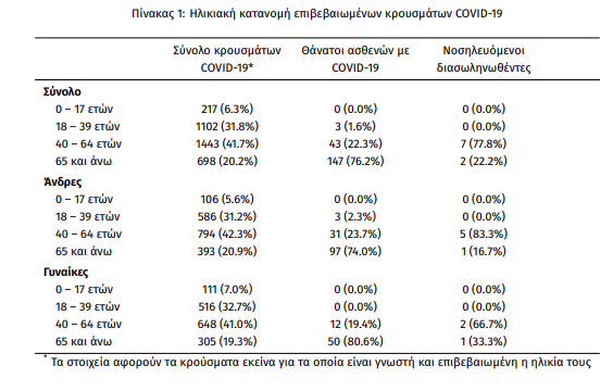 Η μέση ηλικία των κρουσμάτων είναι 47 έτη (εύρος 0 έως 102 ετών), ενώ η μέση ηλικία των θανάτων είναι 76 έτη (εύρος 35 έως 102 ετών). Η ηλικιακή κατανομή των (α) συνολικών κρουσμάτων, (β) των περιστατικών που κατέληξαν σε θάνατο και (γ) των ασθενών που νοσηλεύονται διασωληνωμένοι, είναι η ακόλουθη: