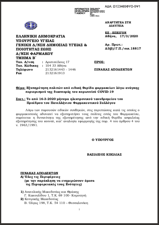 “Λόγω των παρουσών ειδικών συνθηκών, στις περιπτώσεις κατά τις οποίες ο φαρμακοποιός αδυνατεί να εξυπηρετήσει τους πολίτες εντός του Φαρμακείου, παρέχεται η δυνατότητα της εξυπηρέτησης από την ειδική θυρίδα ασφαλείας εξυπηρέτησης του κοινού, κατ’ αναλογία εφαρμογής της παρ. 4 του άρθρου 4 του ν. 1963/1991”.