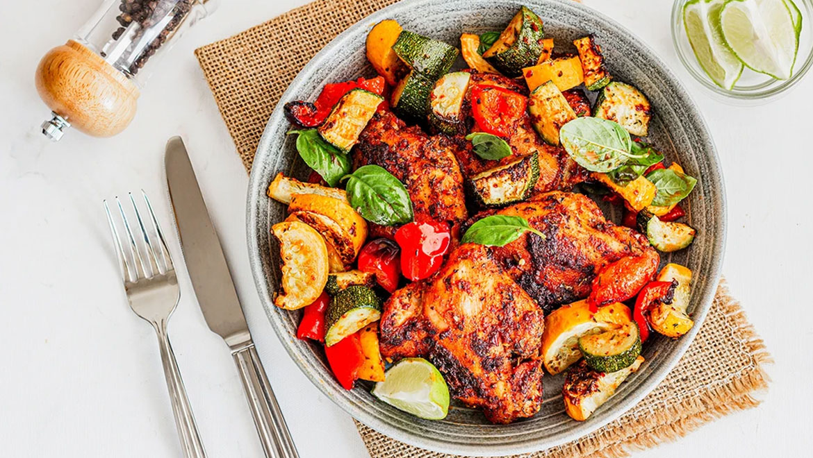 Ψήστε για 30 λεπτά μέχρι να ροδίσει το κοτόπουλο και να μαλακώσουν τα λαχανικά.