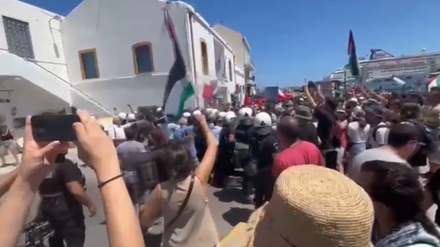 Στο λιμάνι του Αγίου Νικολάου εκτυλίσσονται αυτή την ώρα σκηνές έντασης με 500 άτομα να έχουν συγκεντρωθεί και να διαδηλώνουν ειρηνικά υπέρ της Παλαιστίνης.
