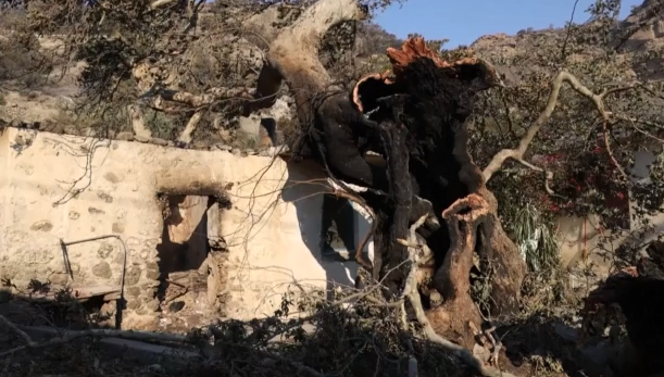 Η φωτιά αφήνει πίσω της ένα αποκαρδιωτικό τοπίο, καμένες εκτάσεις γης και καμένες περιουσίες. Ακόμα και ένας πλάτανος 500 ετών δεν γλίτωσε από την πύρινη λαίλαπα. Η εικόνα των καμένων σπιτιών αποκαρδιωτική.