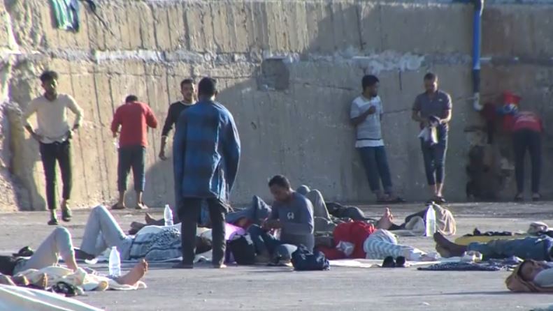 Εξουθενωμένοι – από το ταξίδι και τις υψηλές θερμοκρασίες – πρόσφυγες και μετανάστες ξεκουράζονται στο τσιμέντο, στην προβλήτα του εμπορικού λιμανιού του Ρεθύμνου.