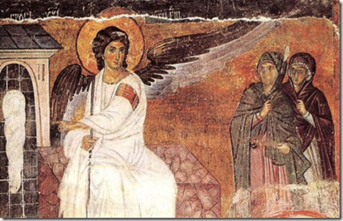 Όταν δηλαδή ο Ιωσήφ και ο Νικόδημος ζήτησαν κι’ έλαβαν από το Πιλάτο το Δεσποτικό Σώμα, το κατέβασαν από τον Σταυρό, το περιέβαλαν σε σινδόνια μαζί με εκλεκτά αρώματα, το τοποθέτησαν σε λαξευτό μνημείο κι’ έβαλαν μεγάλη πέτρα πάνω στη θύρα του μνημείου, παρευρίσκονταν θεωρώντας -κατά τον Ευαγγελιστή Μάρκο- η Μαρία η Μαγδαληνή και η άλλη Μαρία που καθόταν απέναντι του Τάφου.