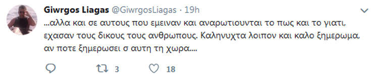Θα πουν την αλήθεια ή και πάλι οι πραγματικοί υπεύθυνοι θα γλιτώσουν στη χωρά της ανομίας, της προχειρότητας, της αρπαχτής και του άρπα κόλλα… Το οφείλουν. Και σε αυτούς που έφυγαν, αλλά και σε αυτούς που έμειναν και αναρωτιούνται το πως και το γιατί, έχασαν τους δικούς τους ανθρώπους. Καληνύχτα λοιπόν και καλό ξημέρωμα, αν ποτέ ξημερώσει σ’ αυτή τη χώρα…».