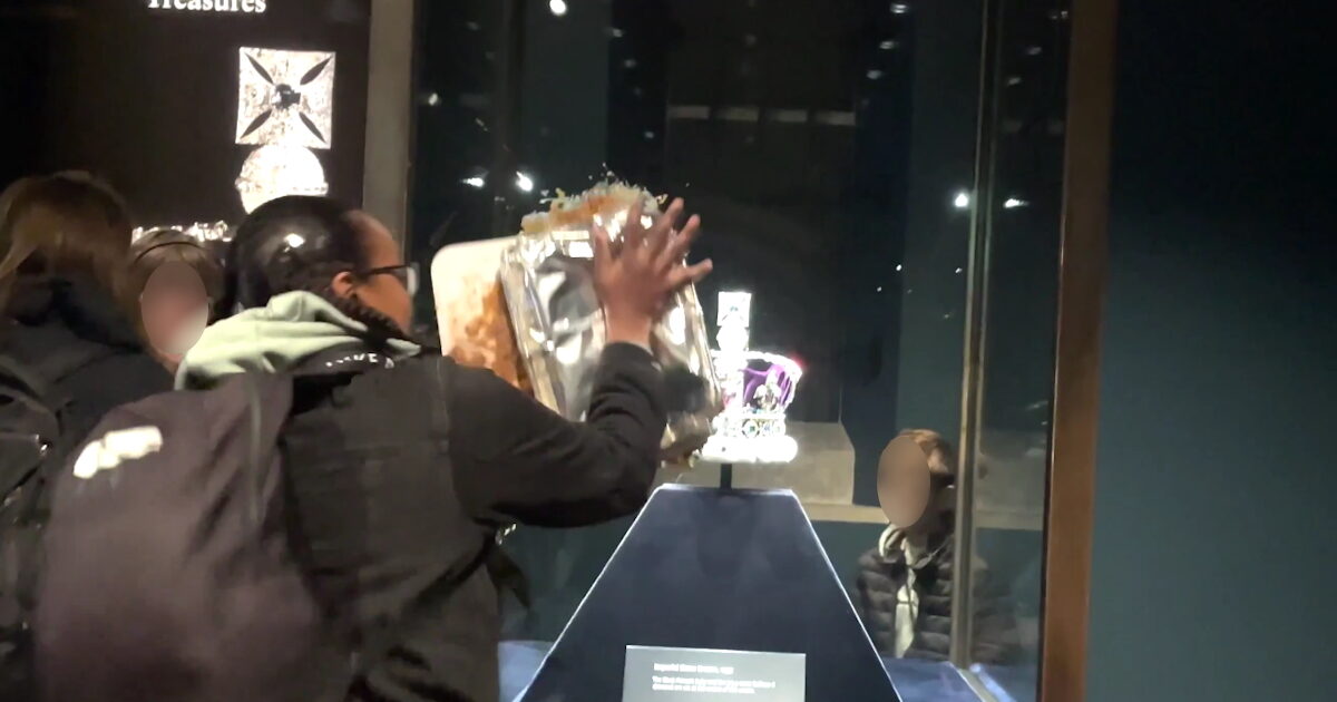 A group calling themselves ‘Take Back Power’ rubbed apple crumble & custard over the crown jewels display