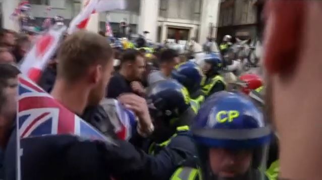 Την ώρα που περισσότεροι από 1.500 αστυνομικοί προσπαθούσαν να κρατήσουν μακριά τη μία διαδήλωση από την άλλη, οι υποστηρικτές του Ρόμπινσον προσπάθησαν να σπάσουν τον αστυνομικό κλοιό και να μετακινηθούν προς την αντιρατσιστική πορεία.