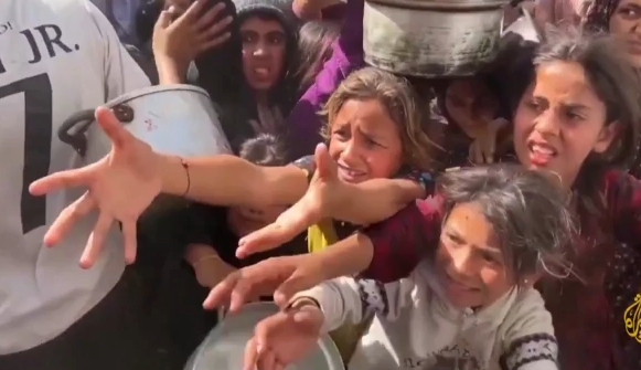 Εξαθλιωμένα από την πείνα παιδιά συνωστίζονται στα συσσίτια για ένα πιάτο χυλό σε συσσίτιο στη Γάζα. Τα καζάνια αδειάζουν γρήγορα και πολλά φεύγουν με άδεια χέρια.
