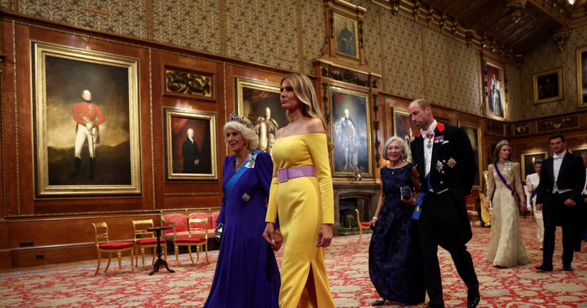 Λίγο το κίτρινο χρώμα, λίγο οι έξω ώμοι και λίγο η ζώνη που επέλεξε η Μελάνια Τραμπ προκάλεσαν αντιδράσεις για το αν τελικά έπρεπε η Πρώτη Κυρία των ΗΠΑ να εμφανιστεί δίπλα στον Βασιλιά Κάρολο και την Καμίλα με αυτή την αμφίεση.