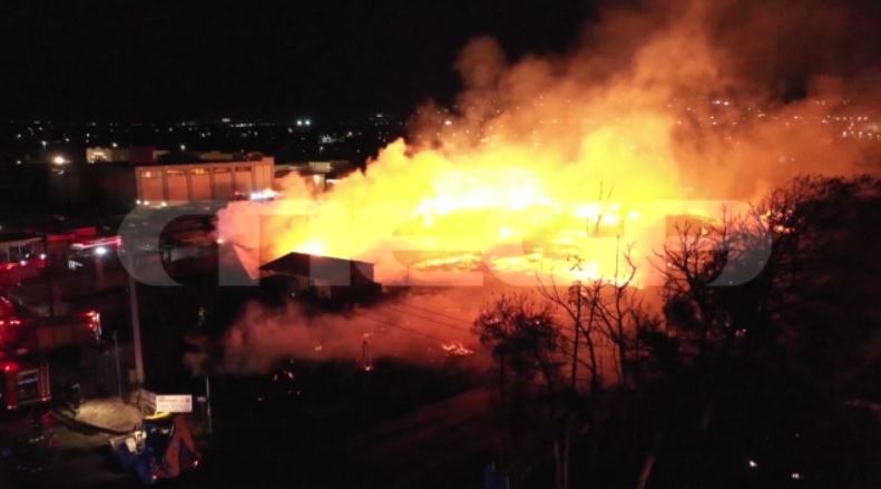 Σύμφωνα με πληροφορίες, το κύριο κτίριο της επιχείρησης έχει καεί ολοσχερώς, όπως και το κτίριο απέναντι, όπου στεγαζόταν βιοτεχνία υποδημάτων.