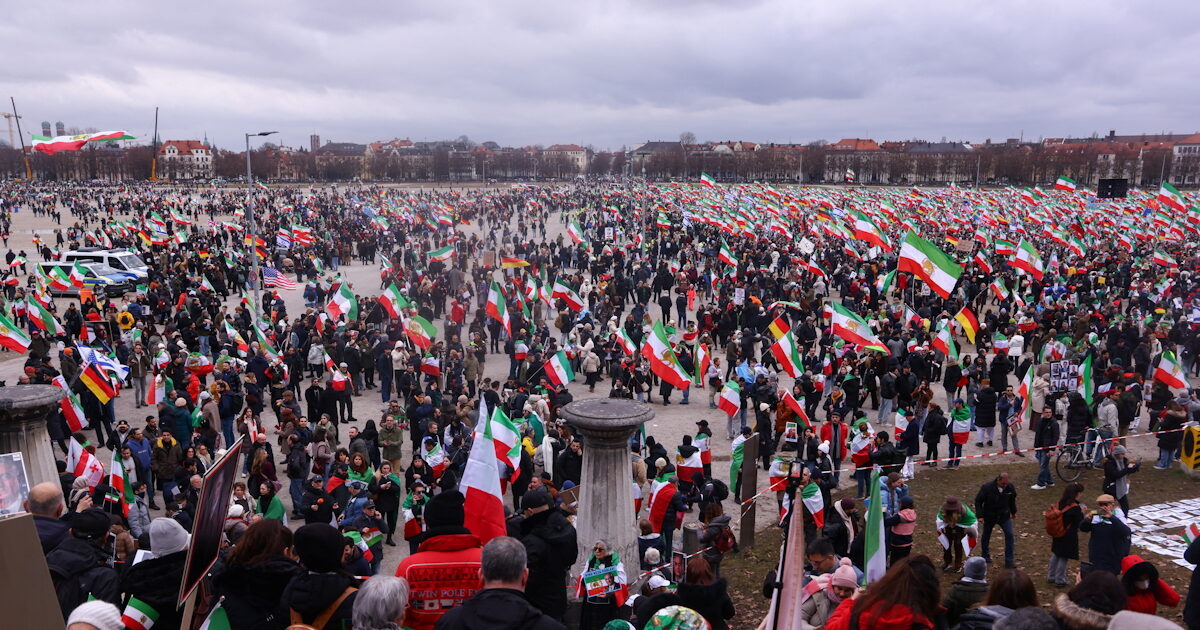 Οι διαδηλωτές συγκεντρώθηκαν ειρηνικά στην Τερέζινβισε, μια τεράστια πλατεία στα δυτικά του Μονάχου, για να απαιτήσουν την πτώση της Ισλαμικής Δημοκρατίας, μετά την αιματηρή καταστολή που έχει καταπνίξει ένα εκτεταμένο κύμα διαμαρτυριών στο Ιράν από τα τέλη Δεκεμβρίου.