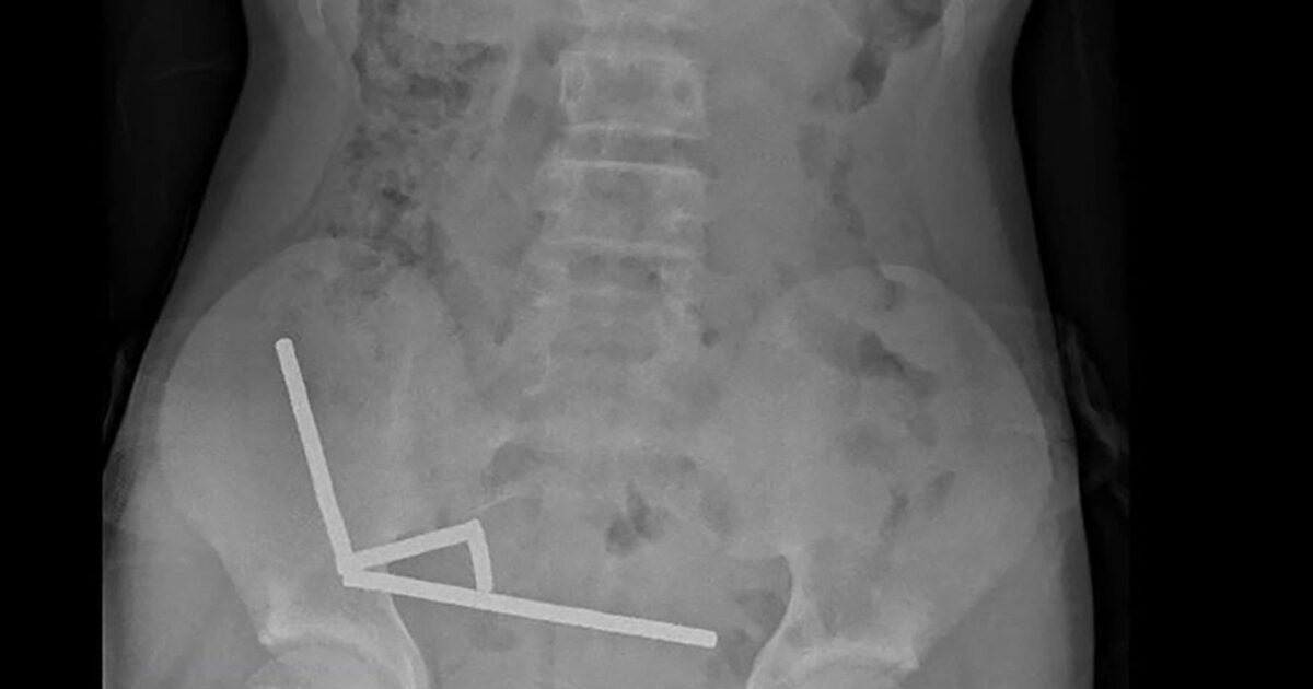 Η ακτινογραφία έδειξε ότι οι μαγνήτες είχαν συγκεντρωθεί σε τέσσερις ευθείες γραμμές μέσα στα έντερα του παιδιού, όπως φάνηκε και στην ακτινογραφία.