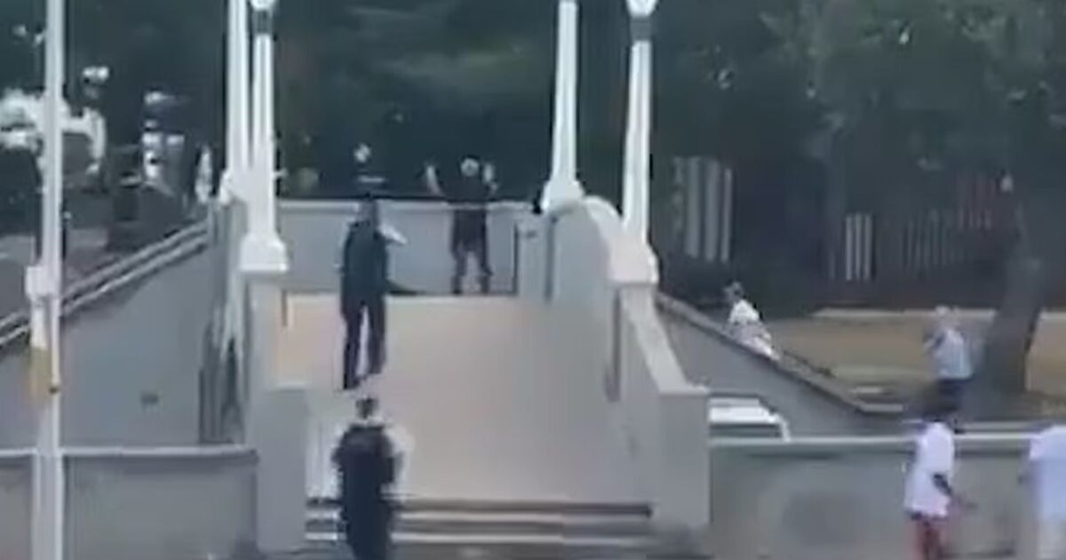 Βίντεο που κυκλοφόρησε καταγράφει τη δραματική στιγμή κατά την οποία ο άνδρας ανεβαίνει προσεκτικά σε πεζογέφυρα, λίγα λεπτά αφότου οι ένοπλοι είχαν ανοίξει πυρ εναντίον του πλήθους, σύμφωνα με την Daily Mail.
