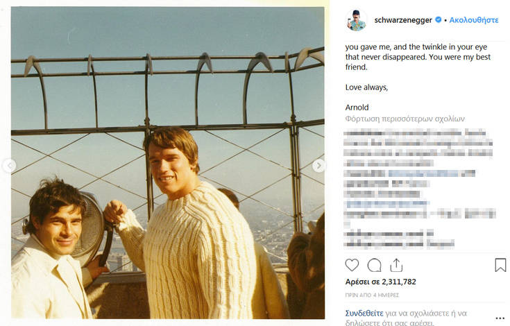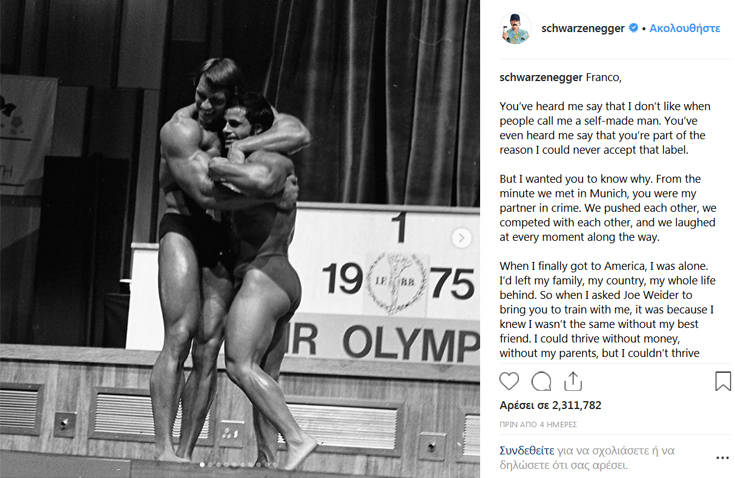 Τον καλύτερο του φίλο Φράνκο Κολόμπου, που έφυγε από τη ζωή, τίμησε ο Άρνολντ Σβαρτσενέγκερ ανεβάζοντας ένα αφιέρωμα στην προσωπική του σελίδα στο Instagram.