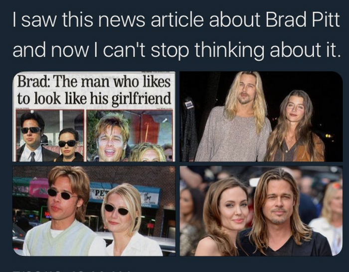 Τα κολάζ λοιπόν ήταν η αιτία να γίνει χαμός στο Twitter με όλους να σχολιάζουν πως το ντύσιμο και το look του Μπραντ Πιτ ταιριάζουν απόλυτα με την κάθε σύντροφο που είχε δίπλα του.