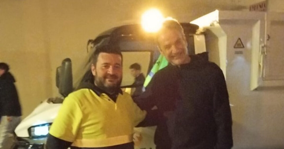 Σε εικόνα που δημοσιεύει το zarpanews.gr την Κυριακή (28.12.2025), ο πρωθυπουργός φωτογραφήθηκε με εργαζόμενο της ΔΕΔΙΣΑ (Διαδημοτική Επιχείρηση Διαχείρισης Στερεών Αποβλήτων).